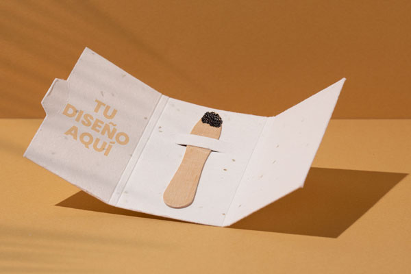 Pflanzbarer Holzstick mit Samen auf der Oberseite. Die Karte ist auf beiden Seiten individuell gestaltbar, so dass Sie Botschaften vermitteln können, die danach zu Pflanzen werden.