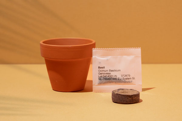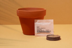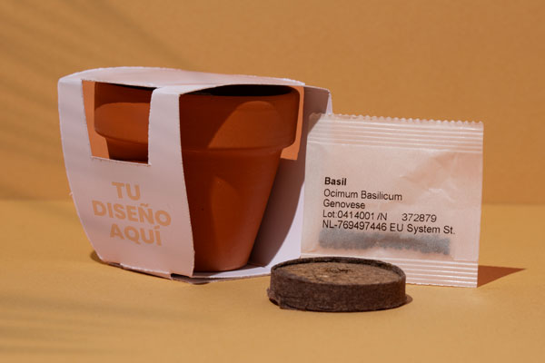 Pflanzset bestehend aus einem Tontopf, einer Torfscheibe, einem Samentütchen und einer personalisierbaren Banderole, die aus Saatpapier gefertigt werden kann. Ein originelles, nachhaltiges Geschenk, das Ihr Engagement für die Umwelt zeigt